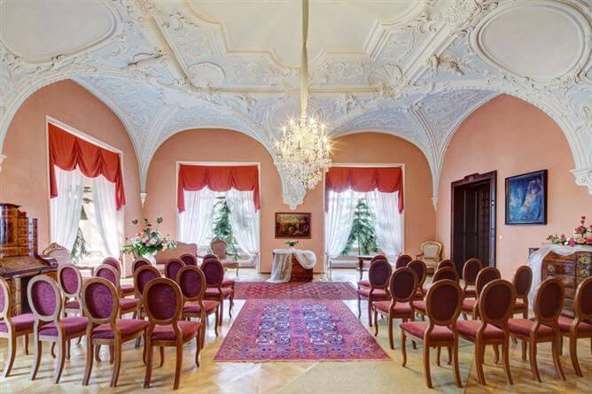 Svatební obřad na Zámku Chyše to není jen pronájem sálu, ale rovněž živý hudební doprovod, originální květinová výzdoba, sklenka sektu jako přípitek pro novomanžele, svědky a oddávajícího a taktéž možnost fotografování novomanželů v zámeckém areálu.