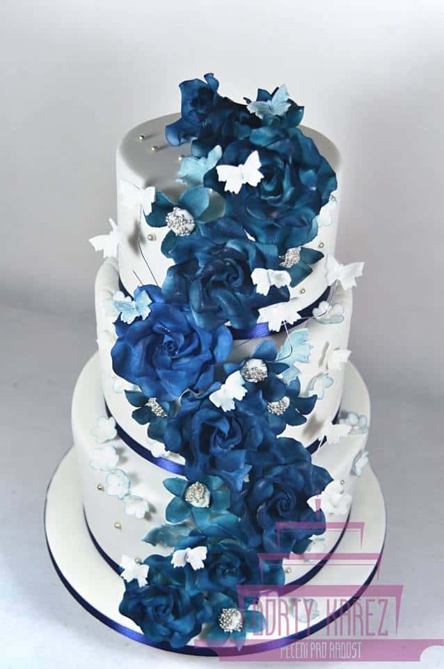 Dorty Kařez – svatební dort tmavě modrý, 1.patro vanilkový korpus, 2. a 3. patro extra čokoládový korpus