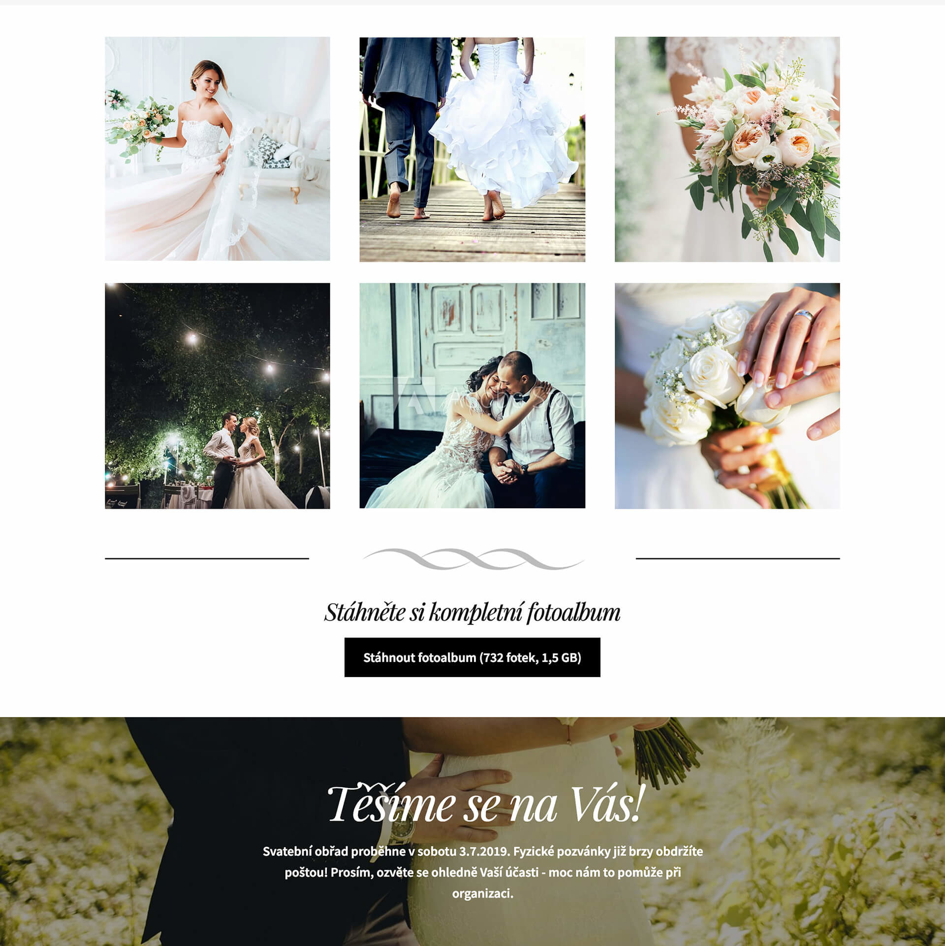 Svatební web jsou Vaše internetové stránky, kde poskytnete rodině a přátelům všechny důležité informace na jednom místě. Svatební web je moderní svatební oznámení online, které Vám usnadní organizaci a plánování svatby. Všem hostům jednoduše a rychle sdělíte veškeré důležité informace přehledně na jednom místě.