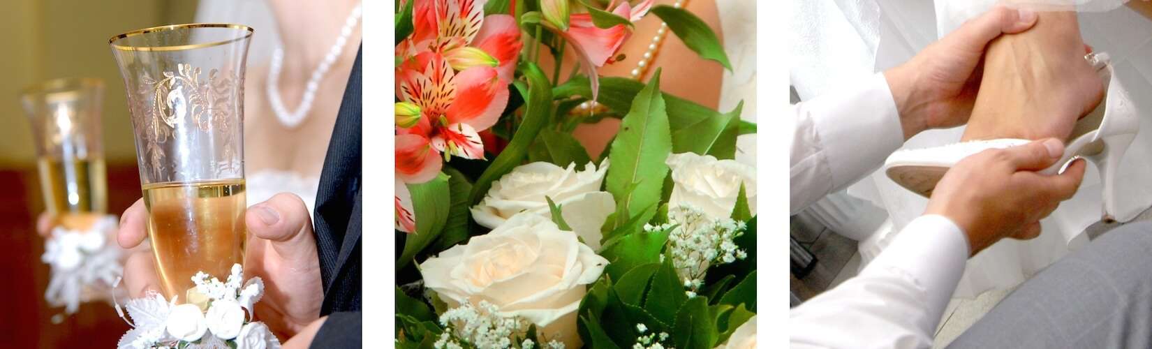 Svatební koláž, sklenička, květiny, střevíček úvodní foto