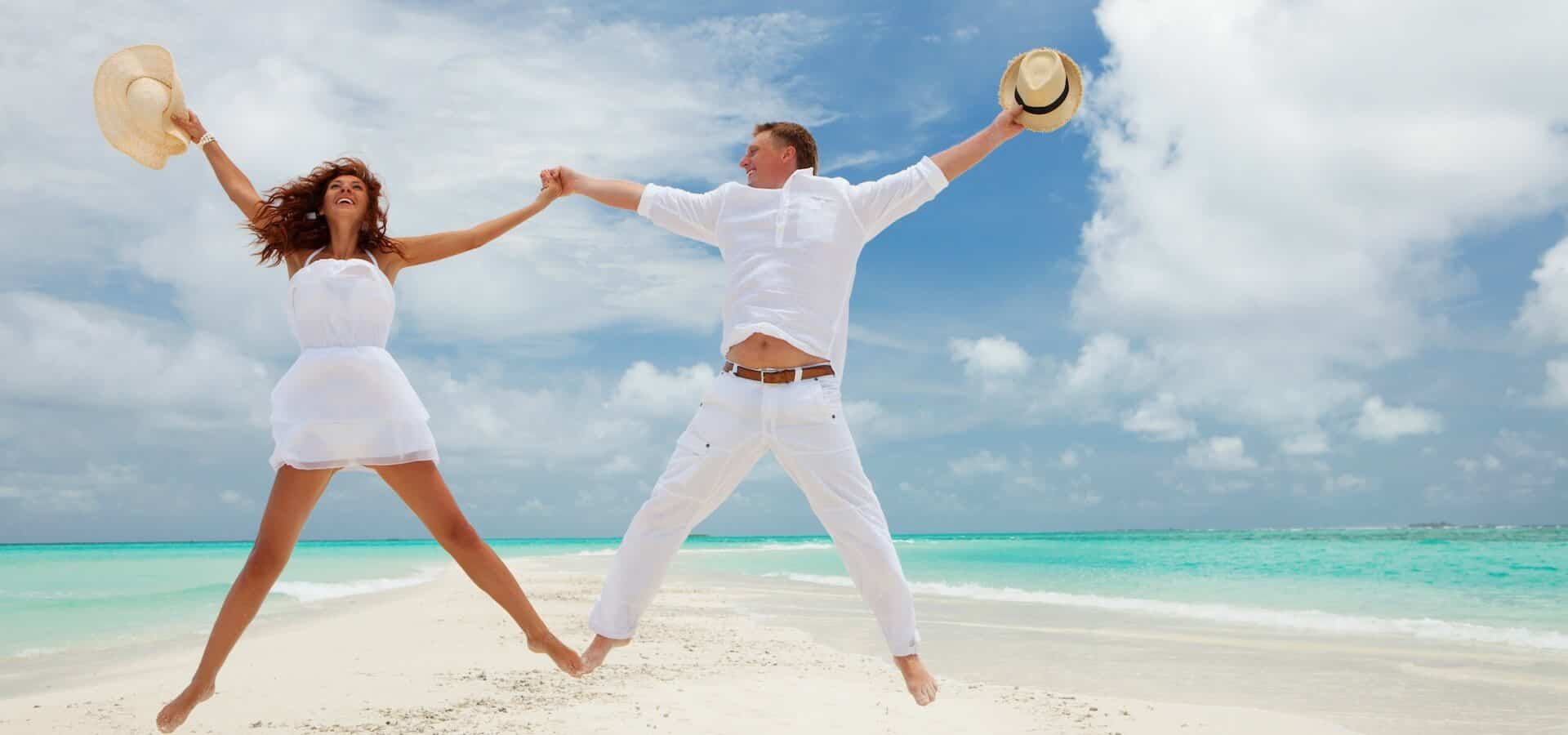 Home/Co obsahují vyladěné balíčky pro rok 2022?/Mladý svatební pár na pláži s klobouky ve výskoku